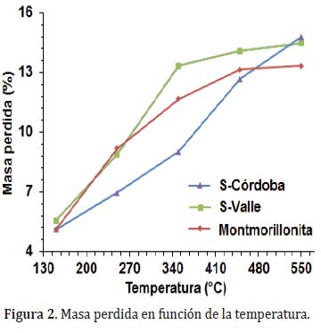 Los resultados obtenidos son congruentes con lo reportado por Villegas (2013) mediante el análisis termogravimétrico de la montmorillonita. Así, se ha indicado una pérdida de peso en el intervalo comprendido entre 20-90 °C que corresponde a la eliminación del agua fisiadsorbida entre las láminas se silicato. Además, una segunda perdida en masa en un intervalo comprendido entre 150-440 °C que corresponde a la fácil remoción de los grupos hidroxilos de los extremos de las láminas de arcillas, los cuales son asociados a la estructura interna de las láminas. Finalmente, la tercera pérdida de peso sobre los 490-700 °C que corresponde a una deshidroxilación total de la estructura arcillosa; mostrando a su vez el comienzo de una posible reorientación de dicha estructura que puede dar origen a un colapso a temperaturas superiores (Villegas, 2013).