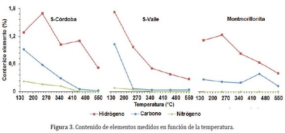 En la Figura 3 se muestra la pérdida de elementos con el incremento de la temperatura. Se puede observar la disminución de los contenidos de elementos como carbono, nitrógeno e hidrógeno provenientes de la materia orgánica del suelo producido por el incremento de la temperatura que causa reacciones de oxidación, convirtiendo la materia orgánica presente en gases que son liberados a la atmósfera y la pérdida total o parcial de sus contenidos, generando cambios en las propiedades físicas y químicas de los suelos. Además, como se observa el nitrógeno por encima de temperaturas de los 350 °C puede llegar a estar ausente y este al ser uno de los nutrientes básicos para las plantas, al disminuir considerablemente sus contenidos se esperan alteraciones de la fertilidad de los suelos.