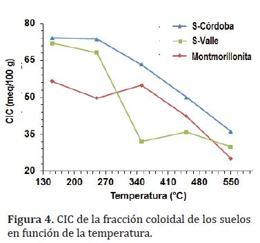 El incremento de la temperatura genera pérdidas considerable en la CIC de la fracción coloidal de hasta el 70 % (S-Valle), como se observa en la Figura 4. Esta disminución se pude explicar debido a los cambios físicos y químicos que experimenta la fracción coloidal. A causa, de la pérdida de la materia orgánica por oxidación térmica, la cual en suelos con contenidos significativamente altos, representará importantes cambios en su CIC. Además, los cambios producto de las altas temperatura en la estructura de los minerales de arcilla a causa de la eliminación del agua adsorbida y la deshidroxilación superficial y estructural, genera la pérdida de sus propiedades (CIC, retención agua) y la imposibilidad de su regeneración natural (Verma y Jayakumar, 2012).