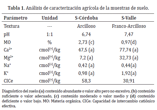 Caracterización de las muestras de suelo. Dos suelos diferentes se recolectaron en los departamentos de Córdoba y Valle del Cauca (Colombia). Previo a los análisis de caracterización, cada muestra de suelo se secó a temperatura ambiente, se molió y tamizó empleando un tamiz de 2 mm. La caracterización de los suelos se efectuó en las instalaciones del Laboratorio de Suelos y Agua de la Universidad de Córdoba (Montería-Colombia). A las muestras se les determinó la textura, pH, bases intercambiables (Na, K, Ca y Mg) y contenido de materia orgánica (IGAC, 2006). Los ensayos fueron realizados por triplicado identificando los suelos como S-Córdoba y S-Valle en concordancia con el lugar de procedencia respectivo.