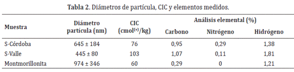 En la Tabla 2 se muestran los contenidos de carbono, nitrógeno e hidrógeno medidos por análisis elemental, tamaño promedio de partícula y la CIC de las muestras. Las propiedades coloidales de las fracciones se evidencian por poseer propiedades características de las arcillas, tamaños de partículas inferiores a 0,002 mm y su elevada capacidad de CIC de 76 y 103 cmol(+)/kg para S-Córdoba y S-Valle respectivamente.
