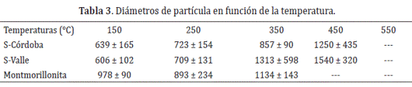 La Figura 5 muestra los tamaños promedio de partícula medidos por DLS de las muestras sometidas a diferentes temperaturas. Se evidencia un incremento del tamaño de partícula a causa de las temperaturas, generando cambios estructurales sobre los suelos. Este fenómeno ocasiona la disminución de la superficie específica de los minerales de arcilla a causa de la deshidrogenación superficial generada por las altas temperaturas que ocasionará nuevos enlaces entre los coloides de arcilla e incrementar su tamaño (Verma y Jayakumar, 2012). A partir de los 450°C se inicia la pérdida de las propiedades coloidales dando como resultado su precipitación total (Tabla 3).