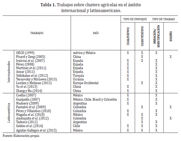 La construcción de clusters agrícolas en las regiones menos desarrolladas, es más difícil, porque el sector está dominado por pequeños productores, sin organización formal que carecen generalmente de la capacidad económica y visión empresarial para proyectarse en un mercado globalizado. Según Gálvez-Nogales (2010), este tipo de agricultores tienen pocos o nulos vínculos con la investigación, la innovación y no siempre cuentan con políticas y programas orientados al fortalecimiento de la estructura de cluster por parte de instituciones soporte y gobierno, lo que dificulta el crecimiento de la masa crítica. Por esta razón, a continuación se revisarán los estudios sobre clusters agrícolas latinoamericanos, cuando la intención fue caracterizarlos o diseñarlos.