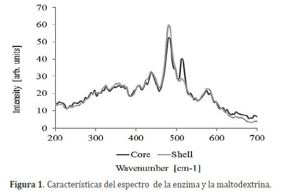 Espectroscopia de Raman. Por medio de espectroscopia Raman se identificaron las características del espectro del material de recubrimiento (Shell) y de la enzima proteasa (Core), se encontraron los picos característicos para cada una de las sustancias en el intervalo de 200 y 700cm-1, se evidenció que el pico más representativo correspondiente a la proteasa se encuentra a 515cm-1 (Figura 1)