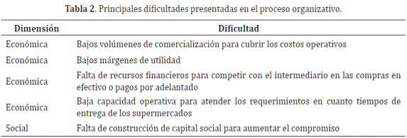 Esta nueva etapa del desarrollo de la organización, obligó a la contratación de personal para atender el mercado final y para el manejo de los recursos y las cuentas de la organización, lo cual implicó el establecimiento de deducciones en el precio de venta para cubrir los costos de personal, lo cual representaba una necesidad de aumentar los volúmenes de acopio y comercialización para cubrir los costos de funcionamiento, enfrentándose la organización a varias limitaciones (Tabla 2).