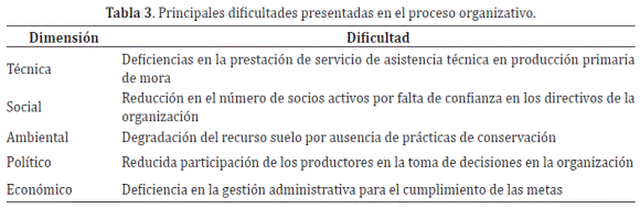 Sostenibilidad de la organización. En 1998, terminó el apoyo que recibía la organización por parte de CENCOA, lo trajo consigo el aumento de las dificultades para la organización (Tabla 3).
