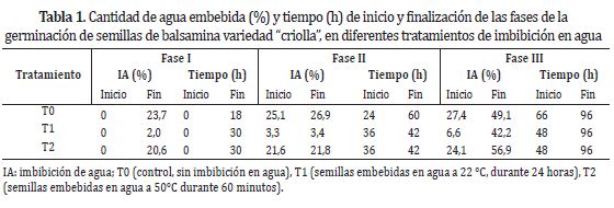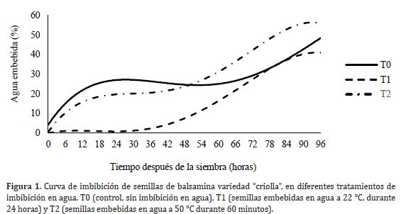Las semillas de balsamina presentan dificultad en la germinación debido a la testa gruesa y dura que rodea al embrión. El objetivo fue evaluar el efecto que tiene la imbibición de semillas de balsamina en agua sobre la energía de germinación, velocidad absoluta de germinación e índice de germinación. Se utilizó diseño experimental completamente al azar con tres tratamientos: T0 (control, sin imbibición en agua), T1 (semillas embebidas en agua a 22°C durante 24 horas) y T2 (semillas embebidas en agua a 50°C durante 60 minutos). El tratamiento T1 se recomienda respecto a los otros tratamientos porque mejoró la energía de germinación (48%), tasa absoluta de germinación (8,6 semillas .día-1) e índice de germinación (11,5).
