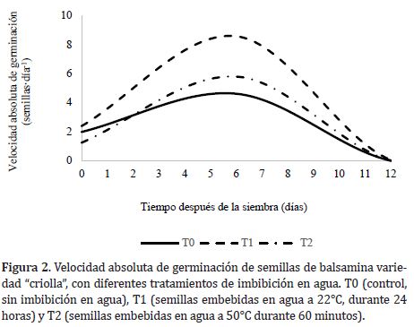 Con respecto a la energía de germinación, en general, se presentaron valores por debajo del 50%, los cuales se pueden considerar bajos (Tabla 2), teniendo en cuenta que para el tratamiento control (sin imbibición en agua) Mahajan y Pandey (2015) reportan un valor de 60%. Sin embargo, los mayores valores obtenidos para T1, en comparación con los de T0 y T2, muestran que la imbibición de semillas en agua durante 24 horas está relacionado con la toma de agua por las semillas y su influencia en la capacidad de germinación, como ha sido reportado para M. charantia por Mahajan y Pandey (2015).