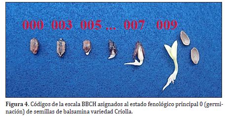 Además, se identificaron las principales fases fenológicas del estado de germinación, a través de la utilización de la escala BBCH (Meier, 2001), con la cual se hace una codificación uniforme de identificación fenológica para todas las especies de plantas mono y dicotiledóneas, que constituye un vocabulario científico común que puede ser entendido de la misma manera por todas las personas vinculadas al estudio e investigación en diferentes campos del conocimiento.