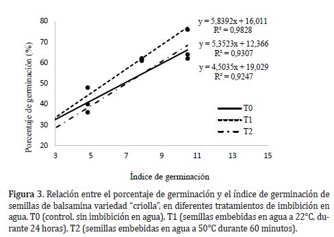 El índice de germinación tuvo una relación lineal significativa con el porcentaje de germinación (Figura 3), lo que coincidió con lo reportado por Islam et al. (2012). La variación obtenida en el porcentaje de germinación para todos los tratamientos, puede ser explicada en términos del índice de germinación, que de acuerdo con Thirusenduraselvi y Jerlin (2007) y Chimonyo y Modi (2013) es una característica intrínseca y de calidad fisiológica de las semillas, que está reforzada por los nutrientes, reguladores de crecimiento y sustancias bioactivas liberadas cuando las semillas se embebieron en agua, y que participan en el ablandamiento de la testa.