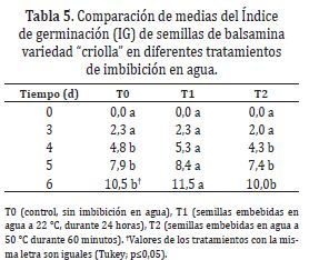 Índice de germinación. Esta variable incrementó a medida que pasó el tiempo, lo que coincidió con lo indicado por Islam et al. (2012), Ünal et al. (2013) y Mehta et al. (2014). En general, hubo valores más altos para T1, cuyos valores promedios superaron en grado significativo a los obtenidos con los tratamientos T0 y T2 desde los 4 hasta los 6 días después de la siembra (Tabla 5).