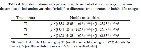 Velocidad absoluta de germinación. Se presentaron diferencias estadísticas significativas entre tratamientos (Tabla 2 y Tabla 3). En la Figura 2 se observa que hubo un patrón de distribución normal, en forma de campana, que concuerda con los resultados de Mehta et al. (2014), con mayores valores a los seis días después de la siembra (Figura 2). Los modelos matemáticos obtenidos para la explicación de esta variable se presentan en la Tabla 4.