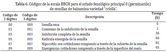 Codificación del estado de germinación. En la Tabla 6 y Figura 4 se muestran los códigos de la escala BBCH asignados al estado fenológico principal 0 (germinación). Se pudo observar que después de sembrar las semillas comenzó la imbibición, que en concordancia con Kanwar et al. (2014) es el primer proceso que debe ocurrir antes de la germinación. Finalizada la imbibición hubo una serie de cambios morfológicos graduales y progresivos en tamaño que explican de acuerdo con Ebert et al. (2014) que el embrión de la semilla reanudó su crecimiento para transformarse en una plántula completa con los siguientes órganos: radícula, hipocotilo y hojas cotiledonales.