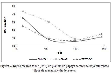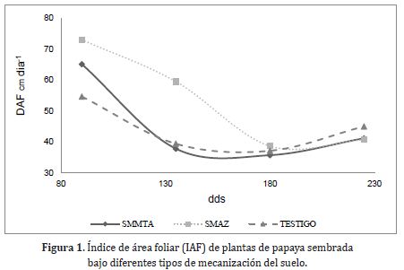 El comportamiento del IAF, bajo diferentes procesos de mecanización del suelo, para el periodo que comprende de los 45-180dds, fue de tendencia decreciente en los tres tratamientos y ascendente para el periodo final del muestreo de los 180-225dds, tal como se indica en la Figura 1. Las plantas del SMMTA mostraron el mayor IAF del ciclo evaluado y en relación con las plantas del SMAZ y Testigo; esta condición se registró solo para el inicio del periodo evaluado, aunque en ninguno de los tiempos se evidenciaron diferencias significativas (P<0,05) entre muestreos según el ANDEVA.