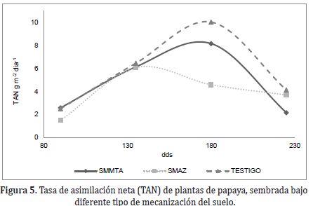 La TAN, es un índice dependiente del peso seco y el área foliar expresado en g m-2 dia-1(Gil y Miranda, 2007). No se presentaron diferencias significativas para la TAN del cultivo de papaya. El comportamiento en las plantas como sistema asimilatorio se observa en la Figura 5. Entre los 90-180dds, la TAN fue ascendente para los tres tratamientos, donde el SMMTA alcanza valores de 2,57 para los 90dds y Testigo 6,46 y 10,04 entre los 135-180dds correspondientes. Para el último periodo evaluado, comprendido entre los 180-225dds se evidenció un decrecimiento en la TAN, tiempo en el cual Testigo alcanza los mayores valores.