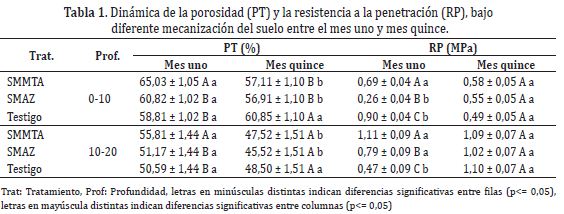Los valores de porosidad presentaron diferencias significativas en el mes uno, entre SMAZ y Testigo respecto al SMMTA (Tabla 1). El SMMTA y SMAZ incrementaron los valores de porosidad en un 10,48 y 3,09%, respectivamente, en la profundidad de 0-10cm respecto al Testigo, en la profundidad de 10 - 20cm el aumento del SMAZ y el SMMTA fue de 9,35 y 1,35%. Los aumentos en la porosidad generan mayor aireación y humedad del suelo (Botta et al., 2007). Las impedancias mecánicas del suelo, medidas a través de la RP, disminuyeron por efecto de la mecanización, presentándose diferencias significativas entre los tres tratamientos en el tiempo uno como se muestra en el (Tabla 1). En la profundidad de 0-10 cm en SMMTA y SMAZ presentaron una disminución en la RP de 85,50 y 62,31% en su orden respecto al testigo. En la profundidad de 10-20cm la disminución fue de 57,65% para SMMTA y 28,82% SMAZ respecto al testigo, resultados similares fueron reportados por Álvarez et al. (2006) que en los primeros 25cm del suelo registraron disminuciones de RP en 37% después de mecanizado el suelo. Los tres tratamientos no presentaron problemas de compactación, según los siguientes umbrales propuestos por Álvarez et al. (2009) de 1,5 MPa (50% de disminución en el crecimiento radical de maíz) a 3MPa detenimiento del crecimiento radical), aunque estos valores varían según las condiciones fisiológicas del cultivo, Jorajuria y Draghi (2000) encontraron niveles críticos de RP>2,0Mpa y Díaz (2004) reporta niveles críticos de RP entre 1,22 y 2,00MPa (prof.<0,20m). Se presentó un incremento significativo (P<0,05) de RP del tiempo uno al tiempo dos en SMMTA en las profundidades de 0-10 y 10-20cm y en SMAZ en las profundidades de 0-10 concordando con lo encontrado por Elissondo et al. (2001). El mayor aumento de RP en las diferentes profundidades lo presento SMMTA. En la profundidad de 10-20cm igualó los valores de RP del tiempo uno del testigo (Tabla 1). Este comportamiento puede ocurrir por diferentes razones, entre ellas, el proceso reordenamiento de las partículas del suelo, tal como lo señalan Bravo y Andreu (1995), por las gotas de lluvia debido que en el momento que caen en la tierra desintegra los agregados, dispersa la arcilla (Richart et al., 2005), generando una película de agua que obliga a infiltrar las fracciones texturales, primero arena, posteriormente limos y arcilla (Becerra et al., 2005). Aunque la RP en el testigo no presento diferencias significativas entre el tiempo uno y tiempo dos en la profundidad de 0-10cm, hubo una mínima disminución de 0,69MPa a 0,58MPa, coincidiendo con resultados encontrados por Elissondo et al. (2001), pero diferente a lo reportado por Taboada (1998) que encontraró que cuando no se mecanizo el suelo, aumento la resistencia a la penetración en los primeros cm después de un tiempo.