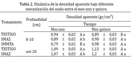 Comparando los datos de Da y RP, esta última presentó diferencias significativas entre los tres tratamientos (Tabla 1) a diferencia de la Da (Tabla 2), corroborando lo encontrado por Álvarez et al. (2009) donde demuestra una baja sensibilidad de este parámetro a los distintos manejos y afirmando lo planteado por Martínez et al. (2010), quienes afirman que la resistencia a la penetración es un parámetro más sensible que la densidad aparente para caracterizar la compactación. SMMTA si presentó diferencias significativas (P< 0,05) con respecto a SMTA y testigo en las profundidades de 0-10 y 10-20cm.