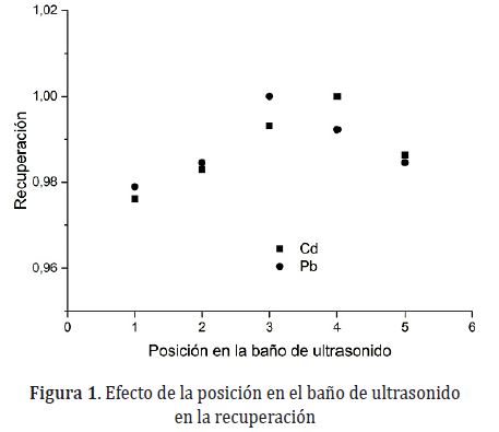 Posición en el baño de ultrasonido. Dentro de las diferentes variables que afectan la digestión de la muestra por ultrasonido, se encuentra la posición de las muestras dentro del equipo, lo cual puede variar la uniformidad de la energía que emite el transductor (Kanthale et al., 2003; Priego y Luque de Castro, 2007a); sin embargo, la recuperación de los metales Cd y Pb del pasto dopado en éste estudio, no presentó diferencias estadísticamente significativas (p>0,05) en las diferentes ubicaciones evaluadas (Figura 1), por lo cual, la posición en el baño de ultrasonido marca Branson 1510 de 2L no influye significativamente en la recuperación de los mismos y por ello, se procedió a utilizar este equipo para la digestión y extracción en cualquier posición.