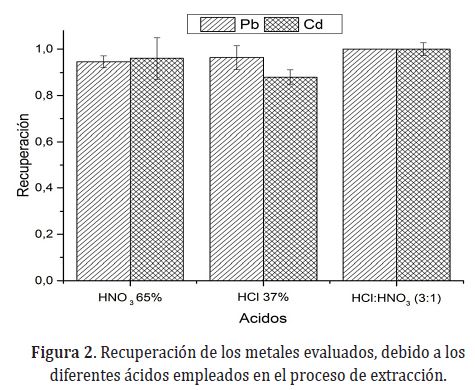 De otra forma, es importante tener en cuenta, que el comportamiento del solvente no es el mismo con respecto a cualquier matriz y analito, por lo tanto, algún fenómeno que modifique las propiedades del solvente como viscosidad, solubilidad o temperatura critica, pueden modificar este umbral (Elik, 2005; Priego y Luque de Castro, 2007a). Los valores normalizados de recuperación para cada uno de los metales con respecto al tipo de ácido utilizado, se encuentran en la Figura 2. Como puede observarse, utilizando agua regia (HCl:HNO3-3:1), se obtuvo una mejor recuperación para Cd y Pb, por lo tanto, se procedió a trabajar con esta mezcla de ácidos para los demás ensayos realizados.