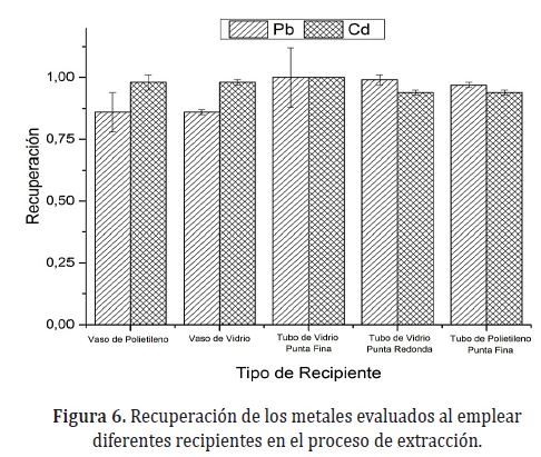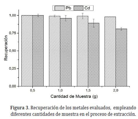 En esta investigación, se encontró que para el Cd y Pb las diferencias no son estadísticamente significativas (p>0,05) entre los diferentes volúmenes evaluados (Figura 4); sin embargo, al utilizar 1,0mL se favorecía la recuperación del Pb y al utilizar 5,0mL la del Cd, por lo cual se decidió trabajar con un volumen de 3,0mL. Adicionalmente, se tuvo en cuenta el hecho que al disminuir la cantidad de muestra empleada (0,5g), un volumen de 5,0mL, resultaba excesivo en el proceso de extracción.