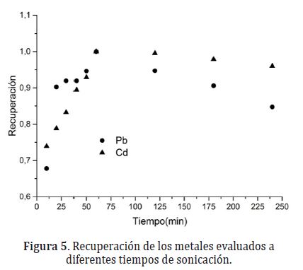 Efecto del tiempo de sonicación. En la Figura 5, se puede observar que el tiempo óptimo para la extracción de los metales estudiados fue de 60min, pues a partir de ese tiempo, disminuye la recuperación de los mismos. De acuerdo con algunos autores, la optimización del tiempo de sonicación es muy importante, ya que un tiempo más prolongado, podría dar lugar a la reducción de los elementos o formación de radicales libres, que a su vez son muy reactivos y formarían parte de una serie de reacciones que involucran a los metales pesados, interfiriendo en el análisis (Brunori et al., 2004). Esto podría explicar, la disminución de la recuperación después de una hora de expuesto el material al ultrasonido en ésta investigación. Por otra parte, la disminución del tiempo reduce los costos, debido a que el analista puede realizar mayor cantidad de ensayos en menor tiempo, con menos consumo eléctrico y desgaste de los equipos de trabajo.
