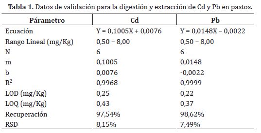 Los valores obtenidos de recuperación de metales pesados (Cd y Pb) y desviación estándar relativa (RSD) reportados en la Tabla 2, son considerados adecuados para el análisis de metales pesados en pastos (Miller y Miller, 2000; Skoog et al., 2005), siendo satisfactoria la reproducibilidad de este método y pudiendo ser utilizado para el análisis de Cd y Pb en muestras de pastos.