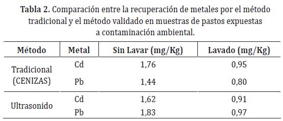 Comparación del método desarrollado con el método tradicional (Cenizas). La determinación de metales a nivel de traza mediante métodos espectroscópicos, requiere de la remoción de materia orgánica, que se puede realizar mediante varios métodos tradicionales (extracción líquido-líquido y digestiones, entre otros); siendo el método más utilizado, la calcinación por vía seca en una mufla, por lo cual en este trabajo decidió compararse este método con el desarrollado. Se analizó una muestra de pasto proveniente de una zona de explotación petrolera de la región del Magdalena medio, lavada y sin lavar antes de su análisis, para determinar la presencia de los metales analizados en la superficie del tejido vegetal. Dichos análisis se llevaron a cabo por el método validado y el método tradicional por vía seca, obteniendo resultados muy similares en cuanto a la concentración de Cd y Pb en la muestra. En la Tabla 2 se presenta la comparación entre las mediciones en mg/Kg entre los dos métodos, en cuanto al Cd por el método de ultrasonido existe una pequeña disminución en la recuperación, comparado con el método tradicional, por el contrario, el Pb presenta un aumento en la recuperación por el método validado. Adicionalmente, se puede observar una disminución en la concentración de metales al lavar la muestra, lo que implica que parte de la concentración de los mismos se encontraba en la superficie de la planta, procedente del medio ambiente y la otra parte, es transferida del suelo a la misma.