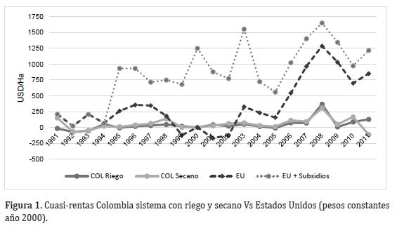 Las cuasi rentas, fueron calculadas para Colombia a nivel nacional y para la zona centro, la cual presenta los mayores rendimientos. En el caso de Estados Unidos, la evaluación se realizó sólo a nivel nacional, debido a la poca diferencia de las variables evaluadas entre las diferentes zonas productoras. Las cuasi rentas se calcularon con y sin los subsidios directos que reciben los productores en Estados Unidos, con el fin de poder mostrar la gran influencia que tienen estos sobre los ingresos de los agricultores.
