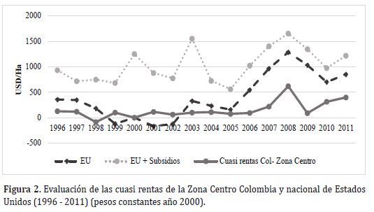 Las cuasi rentas, también se evaluaron comparativamente entre EUA y la Zona Centro (ZC) colombiana, la cual presenta los mejores rendimientos a nivel país predominando la producción en SR. La ZC, tiene una gran fortaleza para la producción de arroz dada la mayor oferta tecnológica y las acciones de transferencia de tecnología que se brindan (Espinal et al., 2005). Entre 1996 - 2011, los rendimientos de ZC fueron 6t/ha semestral, 11% mayores que el promedio nacional con riego y 46% más que el promedio nacional secano. En el mismo período, los arroceros de la ZC obtuvieron un margen de ingresos de 151,7USD/ha, superando en 153% los ingresos promedio nacional con riego y en un 132% promedio nacional secano, mientras que el margen de ganancias, fue del 14% frente al 22% logrado por los arroceros en EUA. Las cuasi rentas promedio de la ZC (Figura 2), fue 3 veces menor que para EUA sin subsidios y seis veces con subsidios.