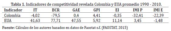 Se calcularon indicadores de competitividad revelada, que son indicadores indirectos pues no identifican los factores determinantes de la misma; estos indicadores demuestran la capacidad que tiene determinado producto o agrocadena para penetrar o mantenerse en mercados internacionales en un espacio de tiempo, mediante el uso de los valores de la producción, exportación e importación de un producto. Para el caso de éste estudio, se realizó por medio de los valores promedio, entre los años 1990-2010 de las exportaciones, importaciones y producción de arroz total en toneladas para Colombia, Estados Unidos y el mundo, cifras obtenidas a través de FAOSTAT (2015).