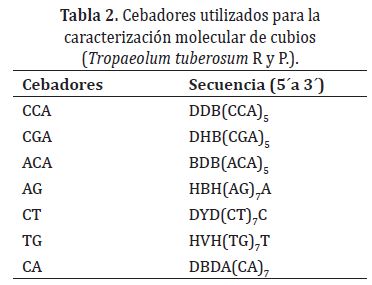 La variabilidad genética de los cubios ha sido descrita frecuentemente en términos de características morfológicas y agronómicas (Malice et al., 2010). Sin embargo, en aos recientes se ha cuantificado su diversidad genética a nivel bioquímico y molecular, utilizando isoenzimas (Monteros, 1997), SRAP (Ortega et al., 2007). La técnica ISSR ha sido exitosamente usada para evaluar la diversidad genética en accesiones cultivadas de oca, ulluco y cubios (Pissard et al., 2006, 2008a, b, c; Malice et al., 2010). Estos estudios demuestran la existencia de variabilidad que debe ser conservada y cómo las prácticas de cultivo de los agricultores influencia la estructura y la diversidad genética de los tubérculos andinos.