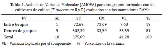 En el Análisis de Varianza Molecular se encontró que las diferencias observadas en los cultivares de cubios se debe a la variación que existe en cada uno de sus individuos, lo cual sugiere niveles de subdivisión mayores a los considerados en este estudio.