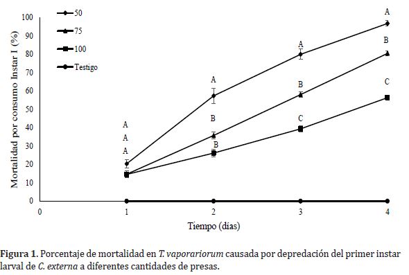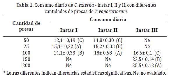 Consumo diario. En relación con el consumo diario promedio de C. externa instar I, II y III, suministrándole diferentes cantidades de presa, se encontraron diferencias significativas (P<0,05) entre todos los tratamientos (Tabla 1).