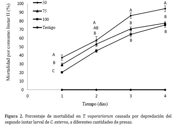 En la Figura 2 se observa un comportamiento ascendente, casi lineal, en todos los tratamientos hasta las 72 horas (tres días) de observación, seguido de una desaceleración de la mortalidad de T. vaporariorum por consumo del II instar de C. externa, respecto a los días anteriores, lo cual indica un consumo menor cuando está por finalizar el instar II después de 72 horas; este resultado contrasta con el obtenido por Auad et al. (2005), donde las larvas después de las 48 horas, tuvieron un consumo menor de presas en todos los tratamientos, empleando ninfas de B. tabaci biótipo B.