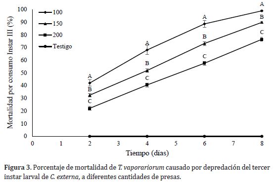 El consumo diario de C. externa en el instar III en todos los tratamientos fue mayor con respecto a los instares anteriores. Esto se relaciona directamente con el mayor tamaño y mayor necesidad de alimento de las larvas de instares avanzados (Bastidas et al. 2010). Lo anterior permite verificar, la influencia entre la densidad de presa y la capacidad de depredación de C. externa. Por ser el III instar el de mayor actividad de consumo como depredador, sería el más apropiado para su implementación como una estrategia de control biológico, teniendo en cuenta sincronizar los ciclos de vida del depredador y de la presa, para garantizar este alto nivel de consumo (Tabla 1).
