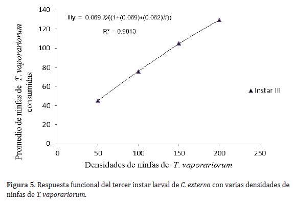 En el análisis de la respuesta funcional del depredador aplicando el modelo de Holling se obtuvo un valor de F altamente significativo, con coeficientes de determinación de R2 para el primer, segundo y tercer instar larval con valores de 0,9950, 0,9977 y 0,9813 respectivamente; lo anterior indica que existe correlación entre el número de presas T. vaporariorum ofrecidas como presa y el número de estas consumidas por C. externa.
