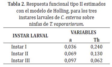 La tasa instantánea de ataque del instar III de C. externa, fue mayor, en comparación con los otros instares evaluados, presentando una relación inversa con el tiempo de manipulación, como se observa en la Tabla 2.