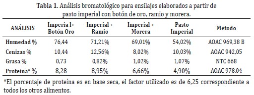 Diseño de tratamientos. Para la elaboración de los ensilajes se siguió el método propuesto por Betancourt et al. (2005) y Cañete et al. (1998). Se utilizaron pasto imperial (70%) Axonopus scoparius (Flüggé) Kuhlm, mezclado con diferentes forrajes (30%), botón de oro Tithonia diversifolia (Hemsl.) A. Gray, morera (Morus alba L.) y ramio (Boehmeria nívea L. Gaudich). Se cosecharon cada uno de los forrajes a ensilar, posteriormente, se sometieron a una deshidratación en campo una vez obtenido un 30 o 40% de pérdida de agua se realizó el picado del material entre 3 y 5cm, aproximadamente. Después de fragmentado el material forrajero se procedió a la mezcla de los mismos, adicionándoles melaza en una proporción de 1Kg por cada 50Kg de forrajes a ensilar. Estas mezclas se empacaron en bolsas negras en forma compacta para extraer el aire y mantenerlas bajo condiciones anaeróbicas, de tal forma que se favorezca una buena fermentación. Las bolsas de silos se almacenaron en estivas en un lugar limpio, seco y fresco.