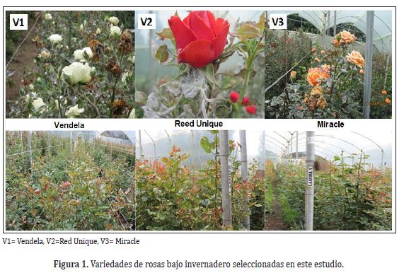 El porcentaje de severidad de S. pannosa var. rosae es mayor con la V1 (Vendela) que con la V2 (Miracle) y la V3 (Reed Unique), pudiendo recomendarse indistintamente para zonas florícolas de Colombia.