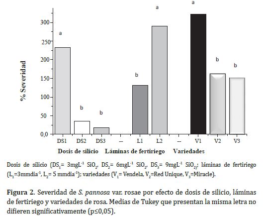 En la Figura 2 se observa que con la aplicación de la DS1 (3 mg*L-1 SiO2) el porcentaje de severidad de S. pannosa var. rosae es de 230%, mayor y diferente a la similitud encontrada entre la DS2 y DS3 (6mgL-1 y 9mgL-1 SiO2) con un porcentaje de severidad de 30 y 20% (p=0,05).