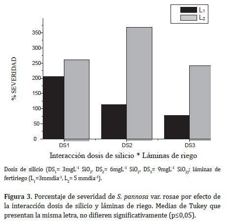 El porcentaje de severidad de S. pannosa var. rosae se incrementó con la DS2*L2 (6mgL-1 SiO2 * 5 mmdia-1) en 370%; sin embargo, la DS1 y DS3*L2 (3 y 9mgL-1 SiO2 * 5 mmdia-1) disminuyeron el porcentaje de severidad del hongo en 255 y 250% (p=0,05) (Figura 3). Los porcentajes de severidad de S. pannosa var. rosae observados con la L2 (5mmdía-1) con todas las dosis de silicio fueron más elevados que con la L1 (3mmdía-1) (Figura 3).