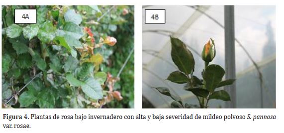 En la Figura 4 (4a) se observa plantas con alta severidad de S. pannosa var. rosae debido a la interacción DS1*L1 y en la (4b) una baja severidad de la enfermedad debido a la influencia de la interacción DS3*L1.