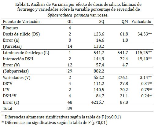 Porcentaje de severidad. Según el análisis de varianza el porcentaje de severidad de S. pannosa se vio afectado por DS (dosis de silicio), L (láminas de fertiriego) y V (variedades) (p=0,01) (Tabla 1). Los porcentajes de severidad del hongo también se vieron afectados por la interacción DS*L (p=0,01); mientras las interacciones DS*V, L*V y DS*L*V no presentaron diferencias sobre el porcentaje de severidad del hongo (p=0,01) (Tabla 1).