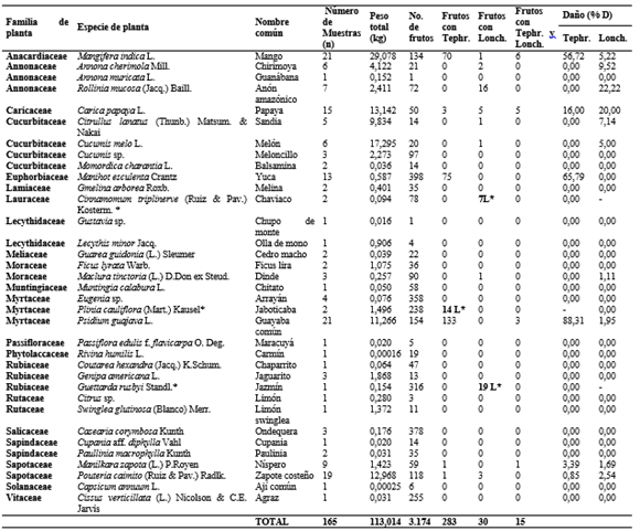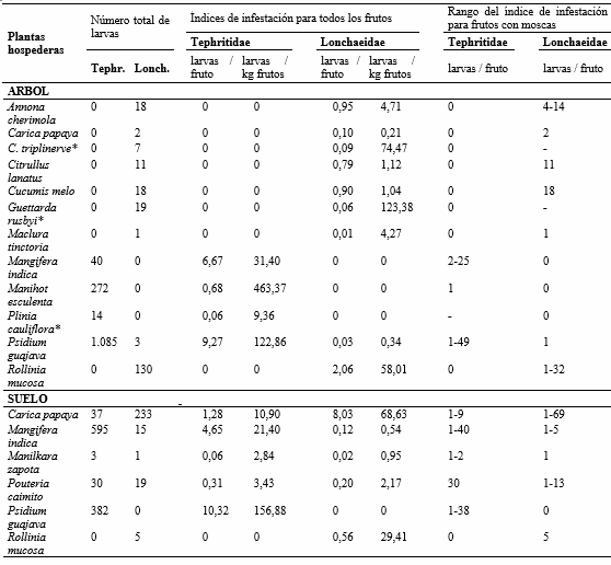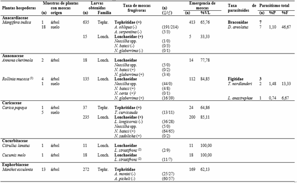 Se coleccionaron 165 muestras de frutos correspondientes a 35 especies de 21 familias de plantas, procesando 3.174 frutos con un peso de 113,014kg (Tabla 1). Del total de muestras de frutos colectadas, el 47% (78 muestras) pertenecientes a 14 especies de plantas y 10 familias, presentaron ataque por moscas frugívoras, 43 de ellas fueron colectadas del árbol y 35 del suelo (Tabla 2). Se colectaron 2.940 larvas de moscas frugívoras Tephritoidea, de las cuales 2.458 pertenecían a Tephritidae y 482 a Lonchaeidae. Emergieron 2.285 adultos, pertenecientes a seis especies de Tephritidae (82,49% de los adultos obtenidos) y ocho especies de Lonchaeidae (17,51% de los adultos) (Tabla 2).