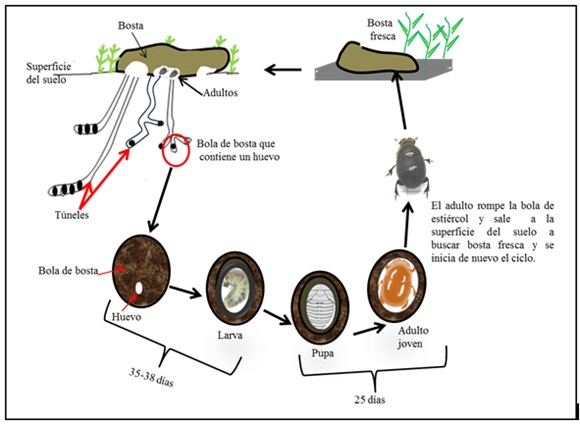 La determinación de los ciclos de vida de los insectos benéficos es importante para conocer los cambios en su crecimiento y desarrollo, conocer las condiciones ambientales y de alimento necesarias para asegurar un ciclo de vida completo y con buena sobrevivencia, con la finalidad de aplicarlos en prácticas de zoocría (Amat-García et al., 2005). Según su comportamiento en la nidificación, los coleópteros coprófagos se han clasificado en tres categorías: los telecópridos o peloteros que forman pequeñas bolas de estiércol y las transportan rodando a un sitio diferente de la fuente de bosta donde excavan en el suelo y forman su nido para la oviposición; los endocópridos construyen galerías dentro de la bosta y anidan dentro de la misma, y los paracópridos o cavadores construyen túneles en el suelo debajo de la bosta dentro de los cuales depositan el excremento para formar sus nidos de crianza (Martin-Piera, 1999; Basto-Estrella et al., 2012). Dentro de cada bola de bosta, la hembra oviposita un huevo; al eclosionar la larva consumirá más o menos la mitad de la bola de bosta y el resto quedará incluido en el suelo. Esta dinámica en pareja se repite varias veces lo que asegura que una buena cantidad de bosta sea enterrada. Esta actividad genera formación de humus y nutrientes asimilables disponibles para las plantas (Basto-Estrella et al., 2012). El estiércol del ganado en el momento de la deposición, contiene aproximadamente un 80% de agua. En peso seco, el estiércol bovino contiene aproximadamente 0,8% K, 0.4% Na, 2,4% Ca, 0,7% P, 0,8% Mg y entre 2,5 y 4,0% de nitrógeno (Floate, 2011).