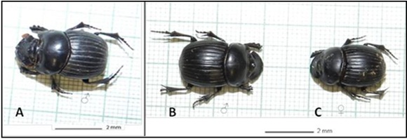 Dichotomiusagenor Harold, 1869 y Dichotomius sp. Estos ejemplares son similares en apariencia y presentan una coloración negra y su tamaño osciló entre 15 y 20mm (Figura 5A y B). Se colectaron en las fincas ganaderas, Campo Alegre, La Arenosa, Cartagena y Berlín. Ambas especies son paracrópidas (cavadoras) y se encontraron compartiendo el mismo hábitat en las bostas examinadas.