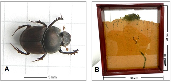 Se introdujo una pareja de cada especie de coleópteros coprófagos por terrario para observar y analizar el tipo y longitud de las galerías que formaban para la cría, la cantidad de bosta enterrada y la descendencia. Las medidas de cada terrario fueron: 34 x 44 x 3cm; como sustrato de los terrarios se empleó arena húmeda y 100g de bosta. Cada vez que se enterraban completamente los 100g de bosta, se reemplazaban por otros 100g. La bosta se mantuvo en refrigeración a -24°C y antes de ser suministrada a los coleópteros se descongeló y se calentó a 20°C.