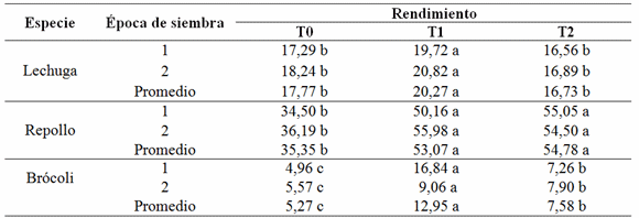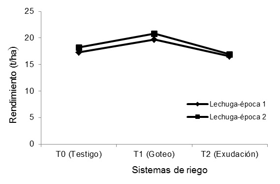 Lechuga. En la Tabla 1 se observa que el mayor rendimiento promedio se obtuvo en las dos épocas de siembra con el sistema de riego por goteo, y se encontraron diferencias estadísticas significativas con respecto a los tratamientos testigo y riego por exudación, los cuales disminuyeron su rendimiento en relación al sistema de riego por goteo en 13 y 17%, respectivamente.