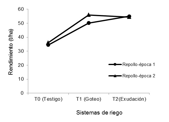 El cultivo de repollo con sistema de riego por goteo presentó rendimiento de 53t/ha, y los tratamientos testigo y riego por exudación disminuyeron el rendimiento 35% de dicho valor.