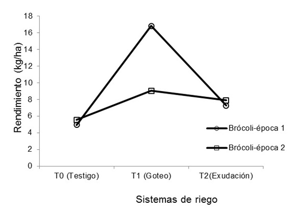 Brócoli. Como se observa en la Tabla 1, se obtuvo el mayor rendimiento promedio con el sistema de riego por goteo, con diferencias significativas respecto a los sistemas por exudación y testigo, a los que superó en 60 y 41%, en su orden.